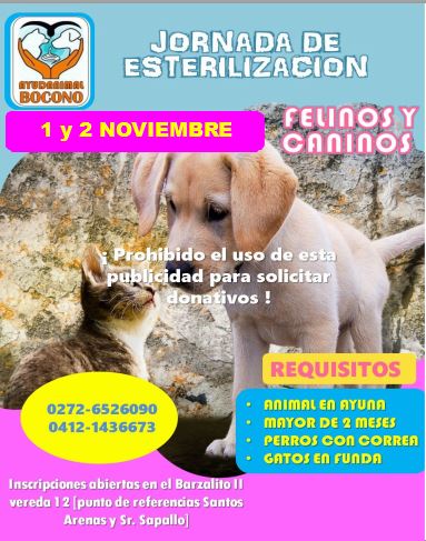 La Asociación Ayudanimal del municipio Boconó, invita a los residentes de sus parroquias para la jornada de esterilización de perros y gatos que se llevará a cabo durante los días 1 y 2 del mes de noviembre.
