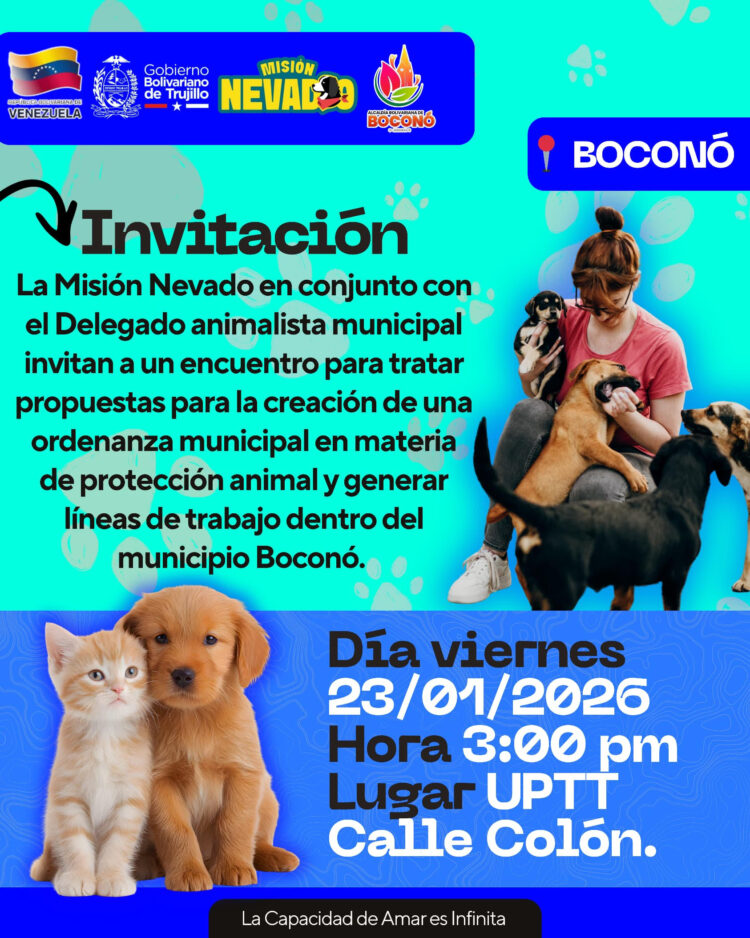 Esta actividad responde al incremento del abandono, maltrato y envenenamiento de animales en distintas zonas del municipio, por lo que Misión Nevado conjuntamente con una delegación de animalistas invitan a un encuentro para tratar propuestas para la creación de una ordenanza municipal en materia de protección animal y así generar líneas de trabajo en el llamado Jardín de Venezuela.