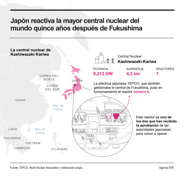 Tokio, 21 ene (EFE).- La compañía eléctrica japonesa TEPCO reactivó este miércoles la central nuclear de Kashiwazaki-Kariwa (KK), la mayor del mundo por capacidad, quince años después de la clausura de la planta en 2011 a raíz del accidente de Fukushima, gestionada por la misma empresa.