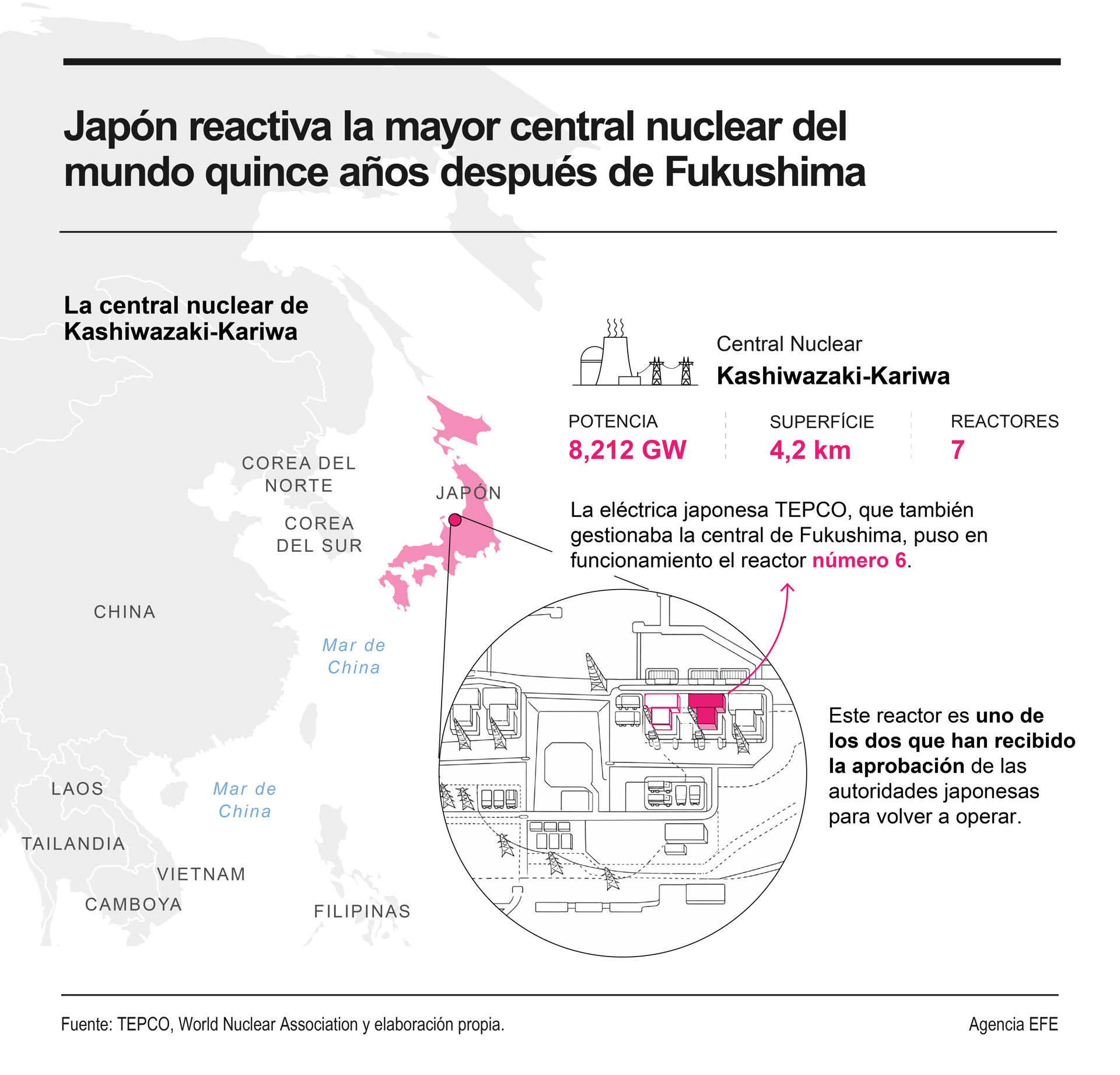 La asamblea de la prefectura de Niigata, donde se encuentra la central, aprobó el pasado mes de diciembre la reactivación del sexto reactor de la planta, después de que el regulador nuclear nacional diera su visto bueno a encender dos de los siete reactores del complejo.