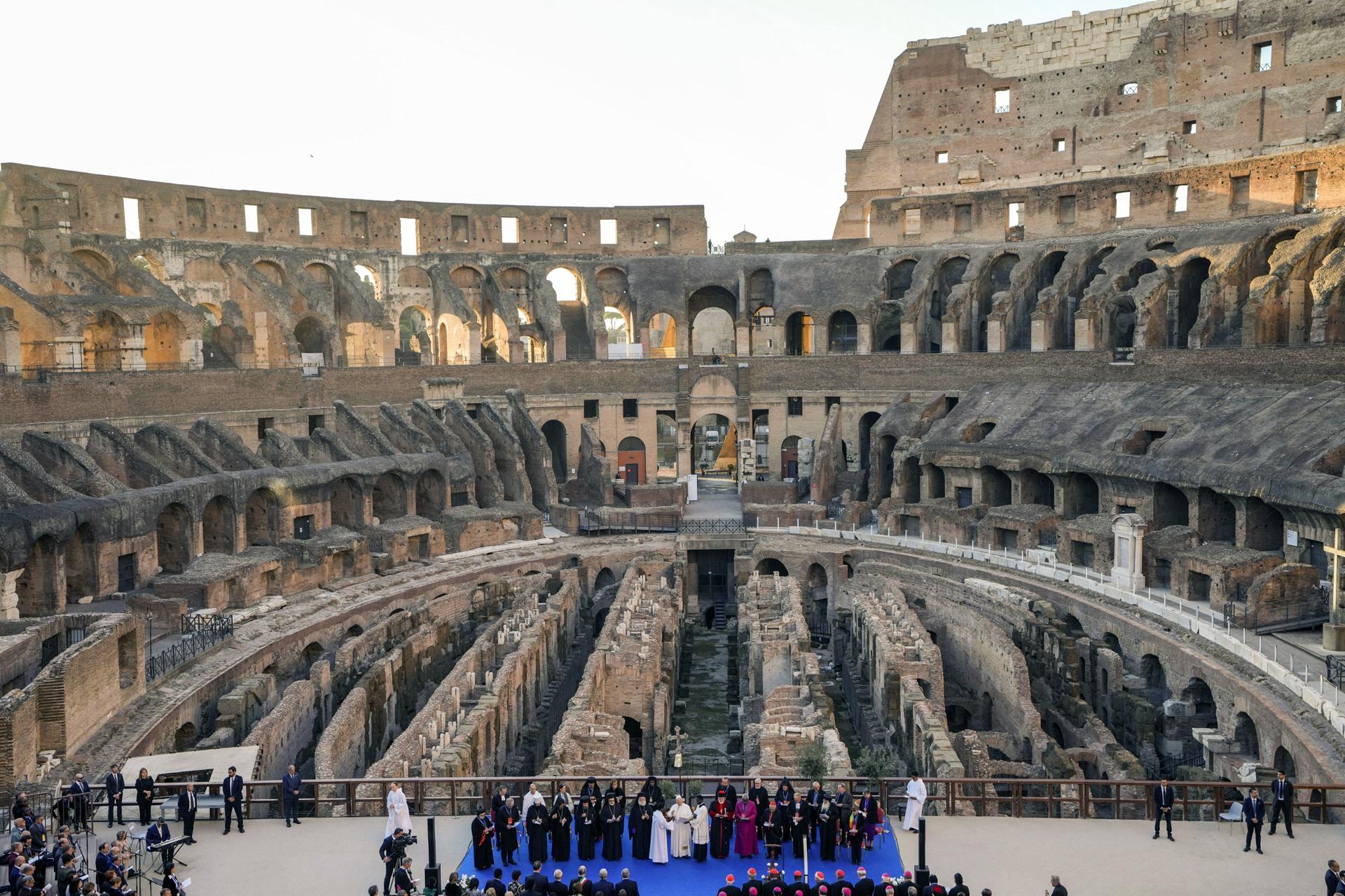 Después, salió al pie del famoso anfiteatro romano para presidir la ceremonia este vez en un escenario colocado a los pies del Arco de Constantino, con líderes judíos, budistas o musulmanes, así como clérigas protestantes, entre otros credos de todo el planeta.