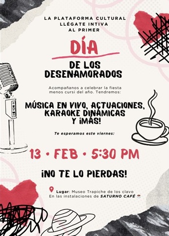 La plataforma cultural Llégate invita a un evento que busca crear un espacio para el talento boconés «¿Cansados de los mismos clichés de cada 14 de febrero? Te invitamos a celebrar con nosotros, por primera vez, el Día de los desenamorados, la celebración menos cursi del año. Sal de la rutina y regresa al mundo real».