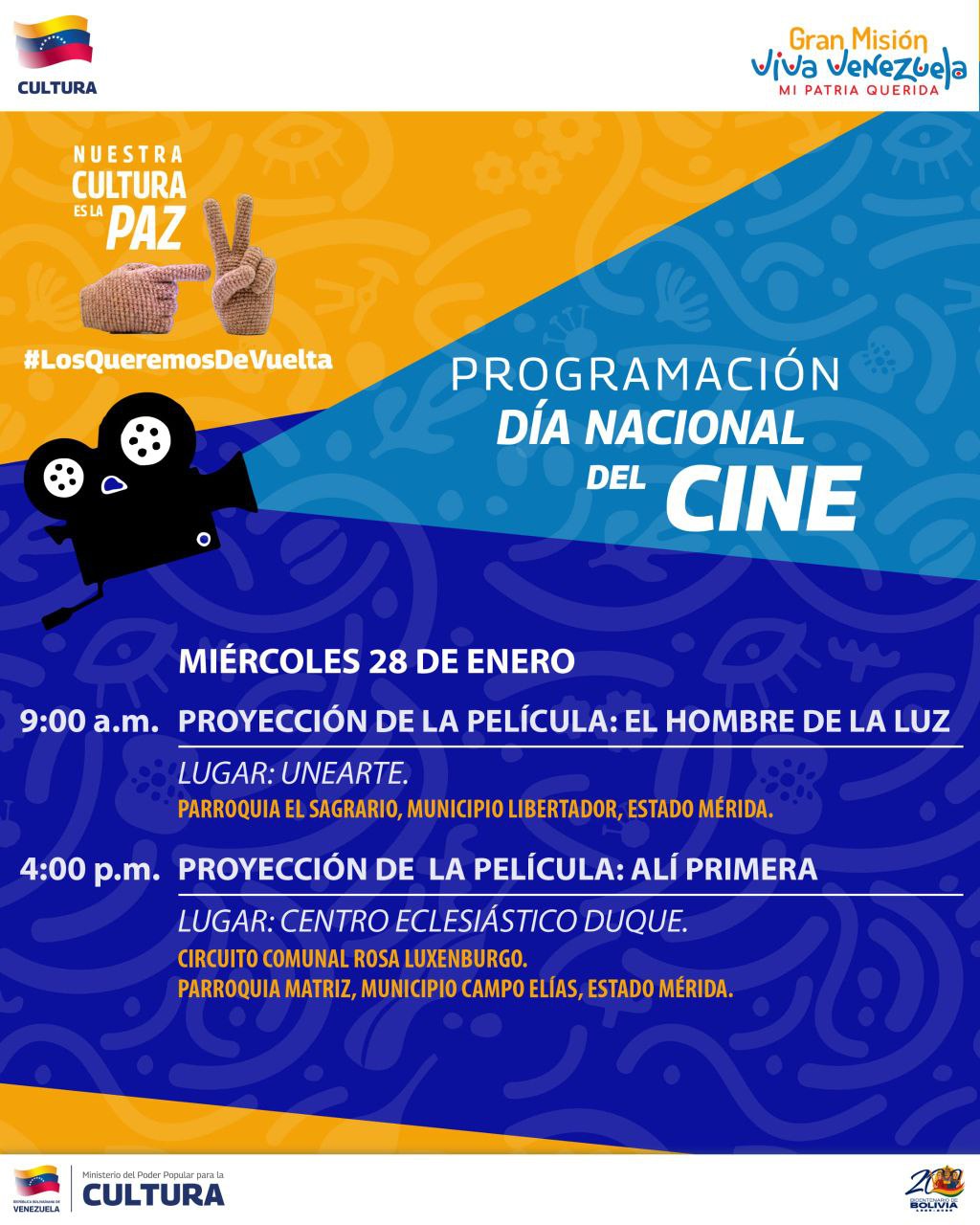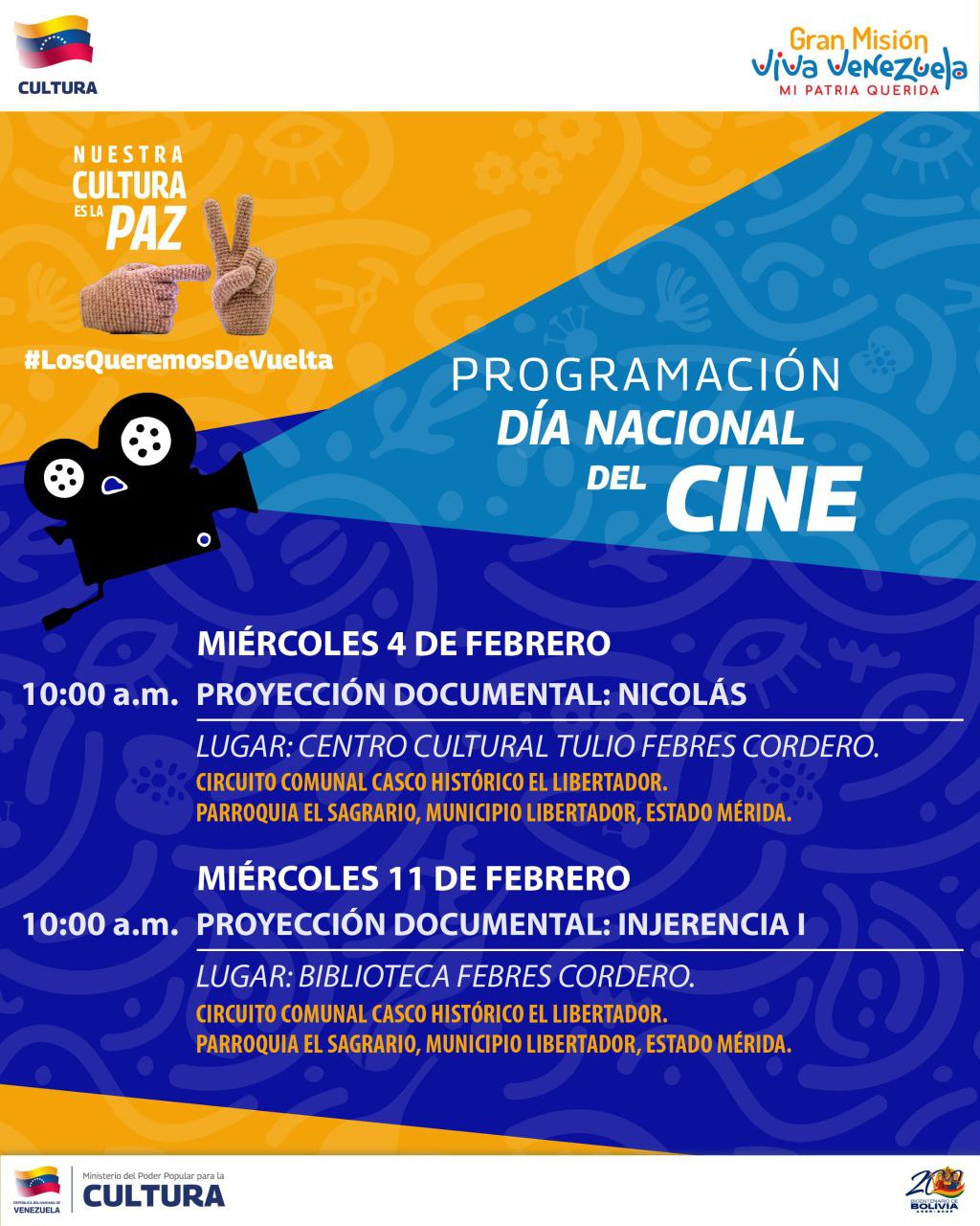 El ciclo de cine se desplegará en diversos puntos del estado para garantizar el acceso de la colectividad. En el municipio Libertador será en el Centro Cultural Tulio Febres Cordero; también se llevará a cabo en el municipio Campo Elías y otros espacios comunitarios itinerantes.