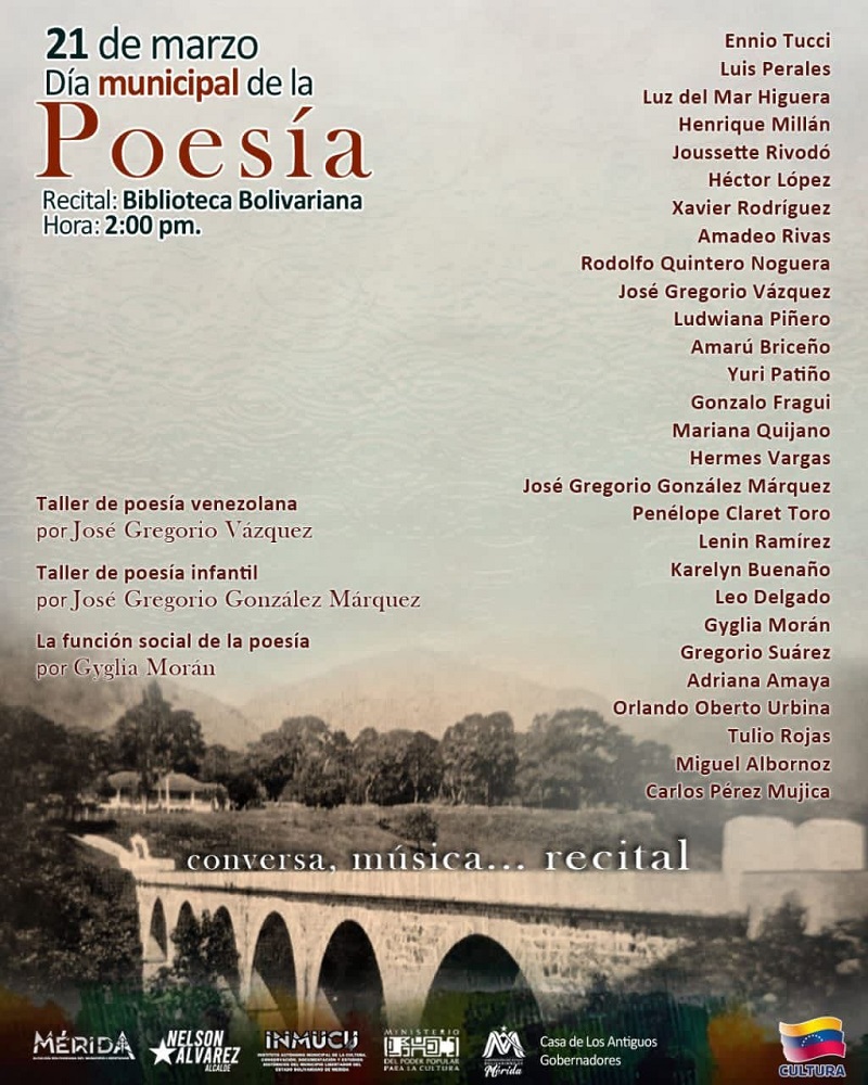 El próximo sábado 21 de marzo, la ciudad de Mérida se vestirá de versos para conmemorar el Día Municipal de la Poesía. Con una agenda que combina la reflexión académica, el aprendizaje creativo y el despliegue lírico, la Alcaldía del Municipio Libertador —a través del Instituto Municipal de la Cultura, Conservación, Documentación y Estudios Históricos (INMUCU)— y diversas instituciones culturales desplegarán una serie de actividades en una jornada dedicada a la palabra.