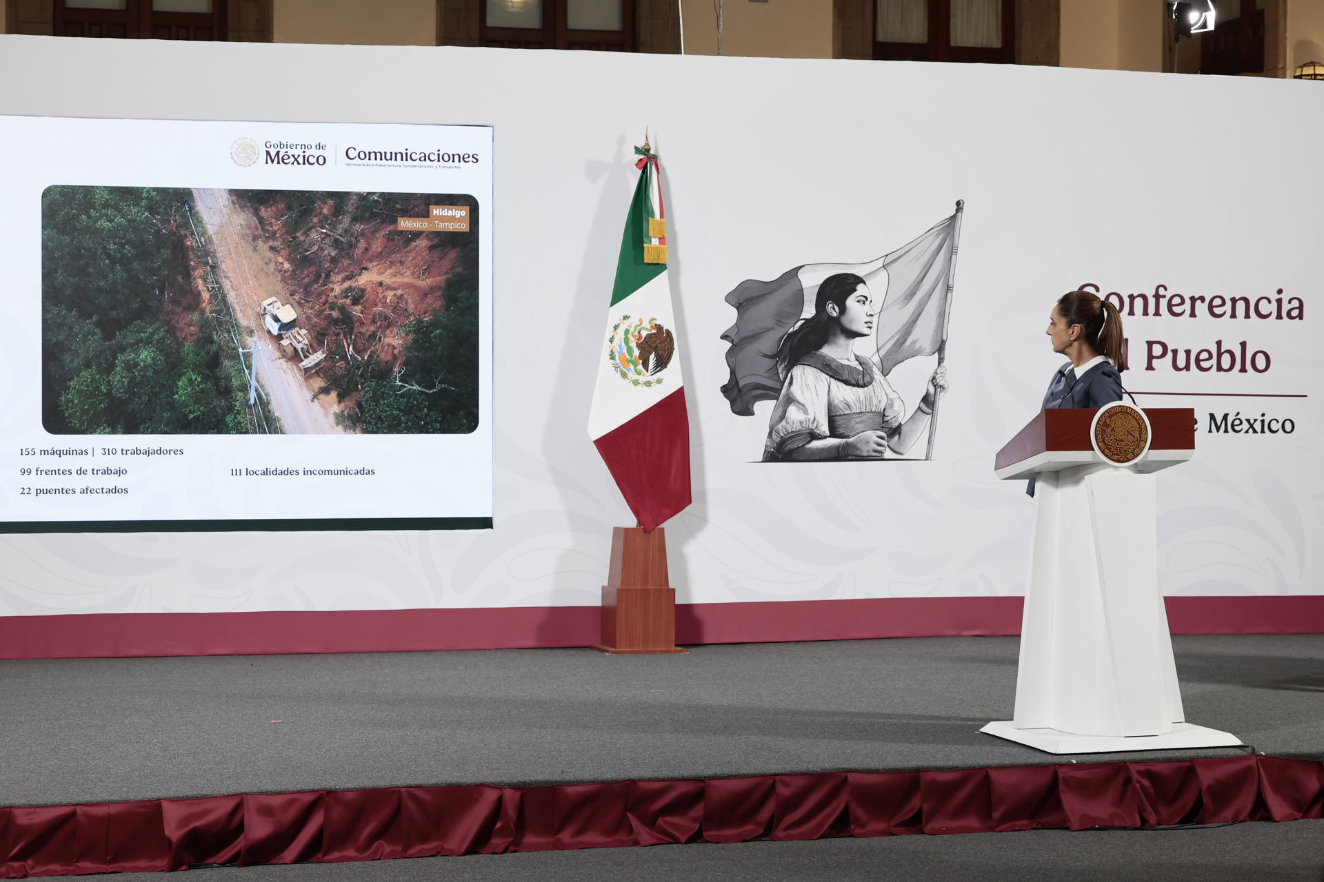 Jesús Esteva, secretario de Infraestructura, Comunicaciones y Transportes informó que se han registrado 376 afectaciones en infraestructura derivadas de las lluvias recientes, de las cuales 161 ya fueron atendidas y 118 siguen en proceso. Hay 54 puentes dañados y más de 5.400 trabajadores y 681 equipos de maquinaria operando en 141 frentes de trabajo.
