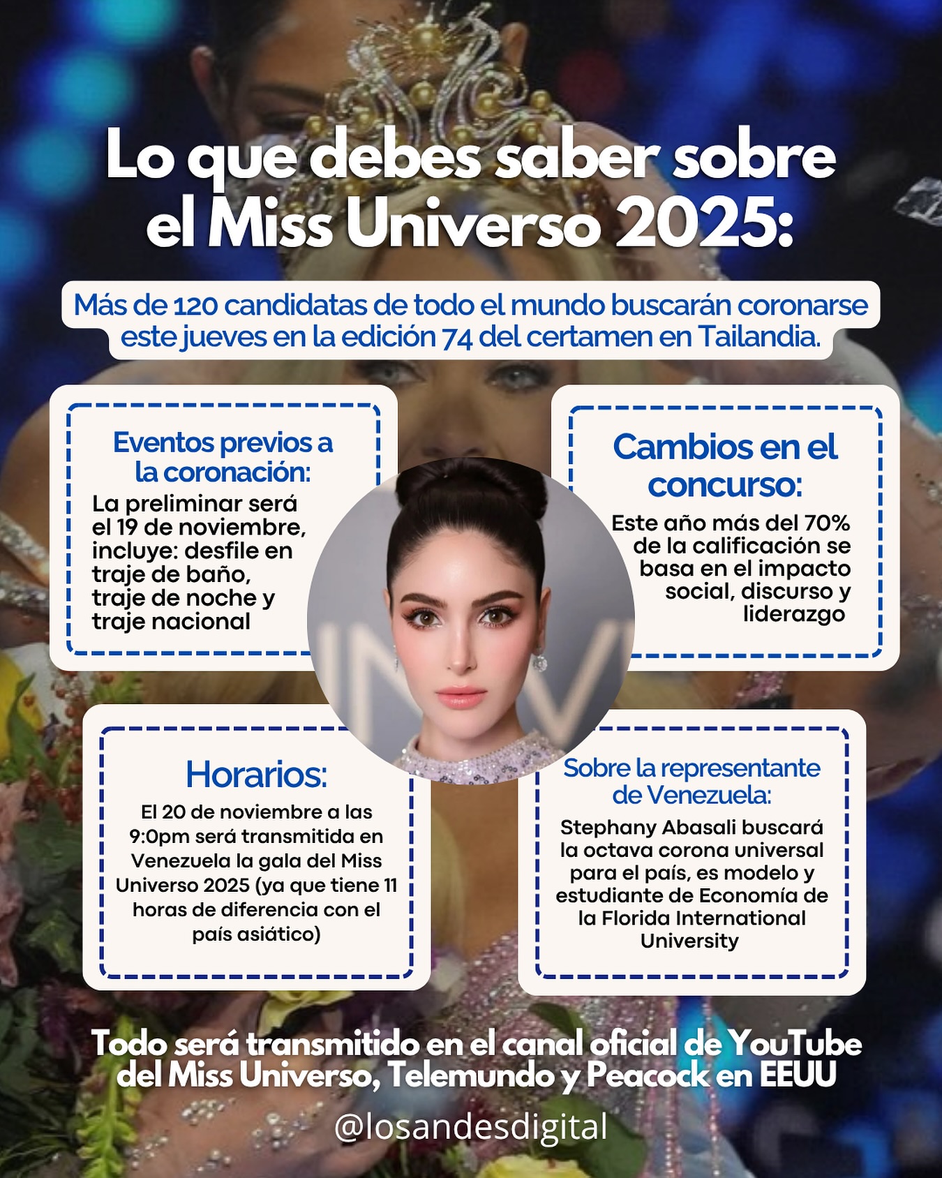 La representante de Venezuela, Stephany Abasali, modelo y estudiante de Economía en la Florida International University, buscará conquistar la octava corona universal para el país, reafirmando la sólida trayectoria de Venezuela en este tipo de concursos.