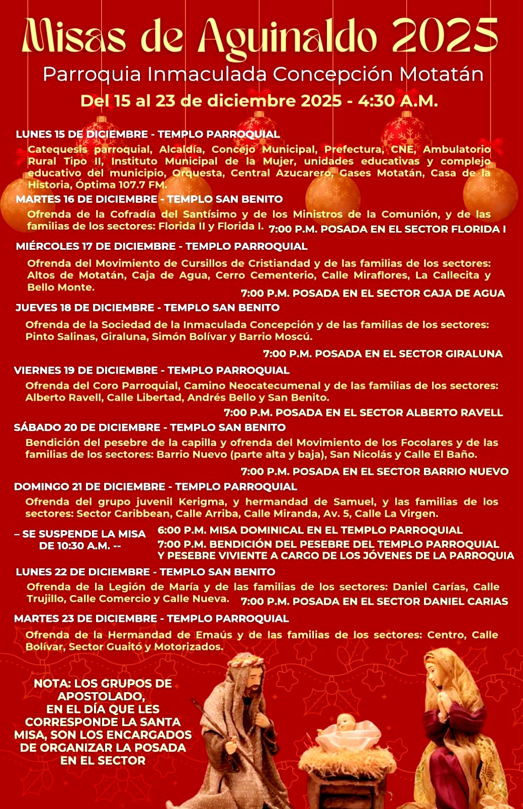 En ese sentido, en el municipio Motatán, la parroquia eclesiástica Inmaculada Concepción”, a través de su párroco Oscar Orellano dio a conocer el siguiente programa “Misas de Aguinaldo 2025, cuya celebración regirá desde el 15 al 23 de diciembre, a las 4:30 am