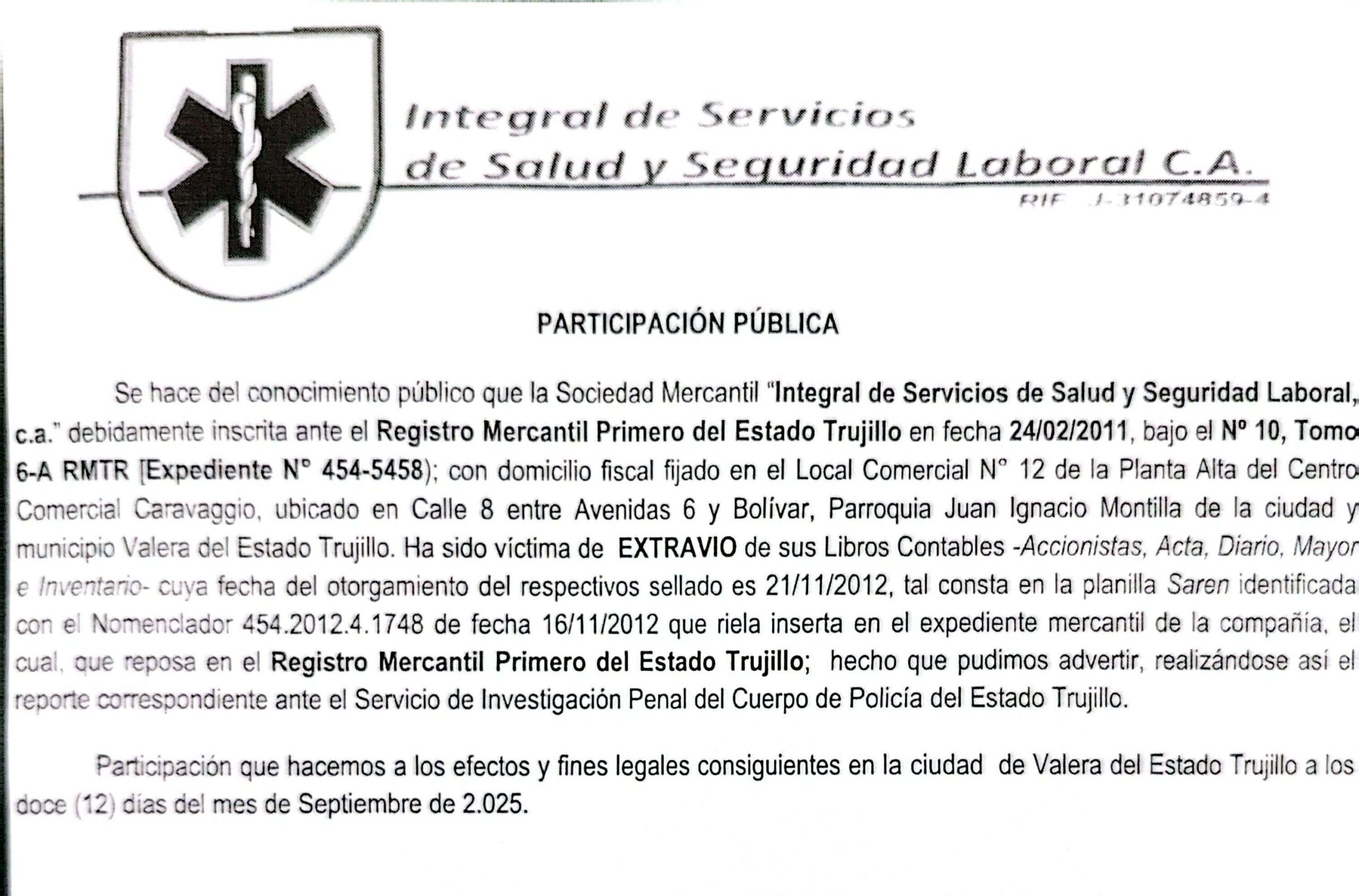 Participación Pública de «INTEGRAL DE SERVICIOS DE SALUD Y SEGURIDAD LABORAL, C.A.»»