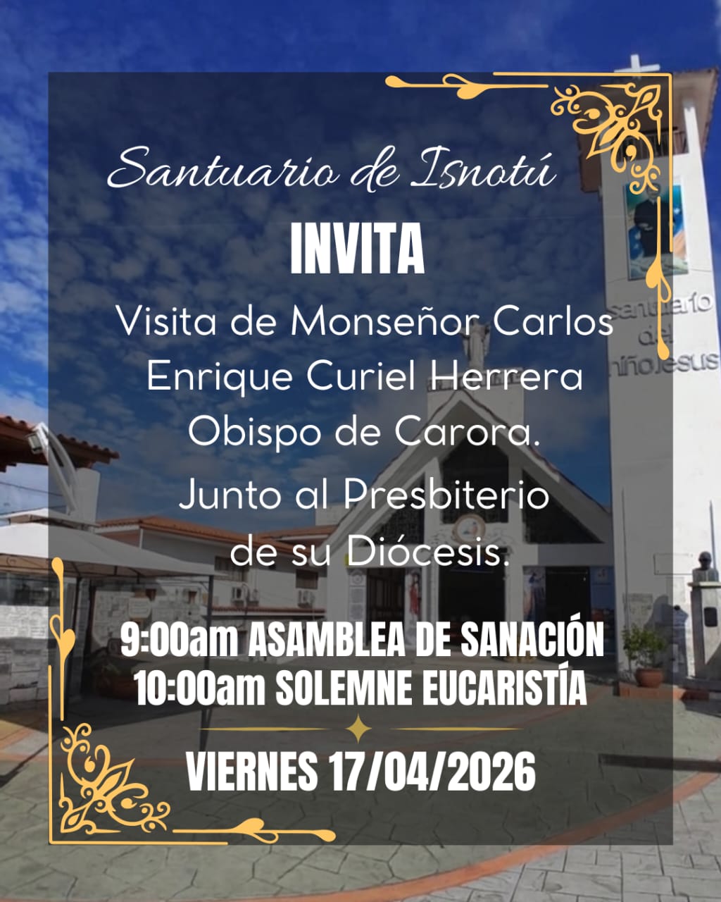 El Presbítero José Magdaleno Álvarez, rector del Santuario Niño Jesús de Isnotú, erigido en memoria de San José Gregorio Hernández Cisneros, reitera la invitación a la jornadas de oraciones que se cumplirán en el sagrado templo este viernes 17 de abril desde las 9 de la mañana, a primera hora, con una Asamblea de Sanación, y a las 10 de la mañana, Solemne Eucaristía.