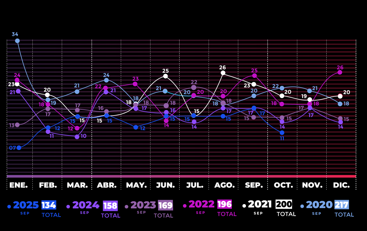 Según el informe, en 2025 se registró un femicidio consumado cada 54 horas y un femicidio frustrado cada 39 horas. Aunque la frecuencia fue menor a la registrada en años anteriores —como 2020, cuando se documentaba un caso cada 34 horas—, la ONG subrayó que la violencia sigue siendo sostenida y grave.
