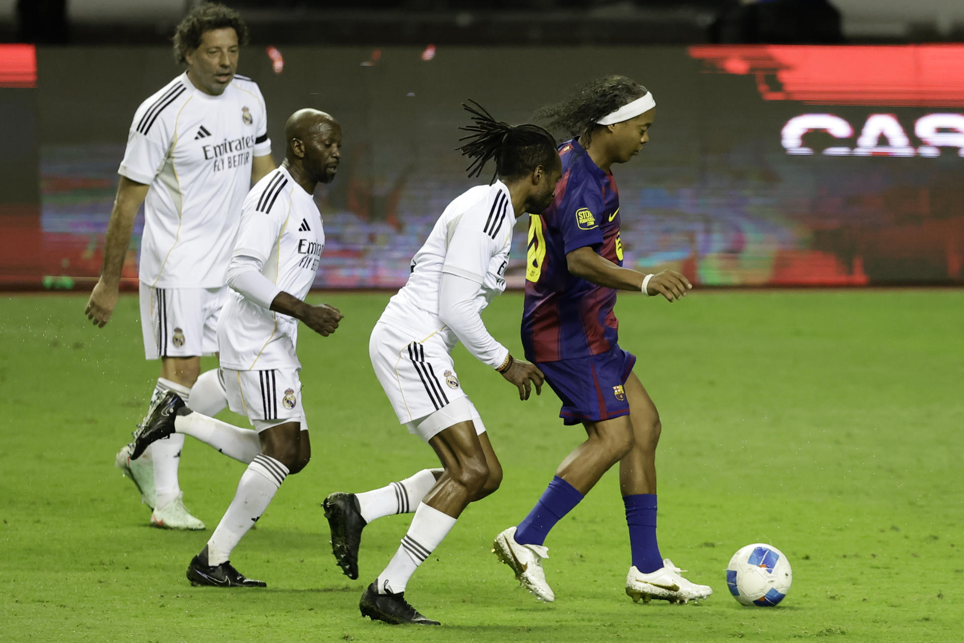En el otro equipo Ronaldinho tiró un par de caños y algunas jugadas de lujo con las que asistió a sus compañeros en el ataque, pero ninguna culminó en anotación.