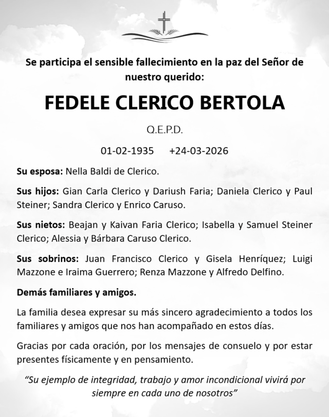 Se participa el sensible fallecimiento en la paz del Señor de nuestro querido: FEDELE CLERICO BERTOLA