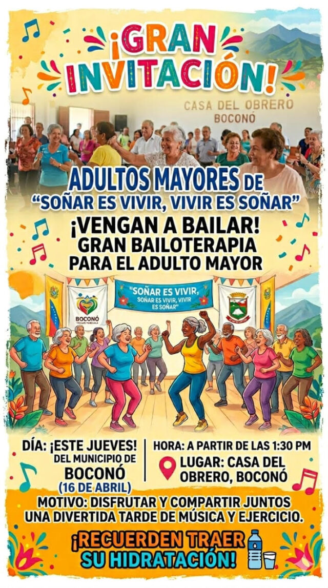La sociedad del adulto mayor del municipio Boconó «Soñar es Vivir, Vivir es Soñar» invita a la población a una actividad especial y recreativa que busca involucrar a los abuelos «Vengan a bailar» una bailoterapia especial para ellos.
