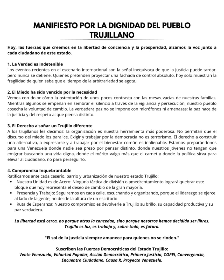 Organizaciones políticas que integran las denominadas Fuerzas Democráticas del estado Trujillo hicieron público un documento titulado “Manifiesto por la Dignidad del Pueblo Trujillano”, en el cual fijan postura sobre la situación política y social de la entidad.
