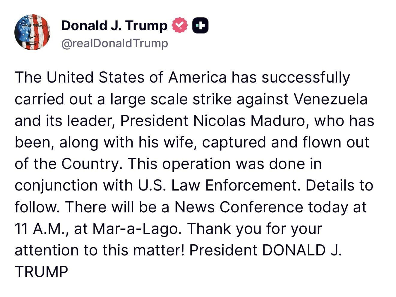 «La operación fue realizada en conjunción con las fuerzas del orden de Estados Unidos», aseguró Trump en un mensaje en la red social Truth Social en la que indicó que dará más información hoy en una rueda de prensa a las 11 de la mañana (16:00 GMT) desde Mar-a-Lago (Florida).