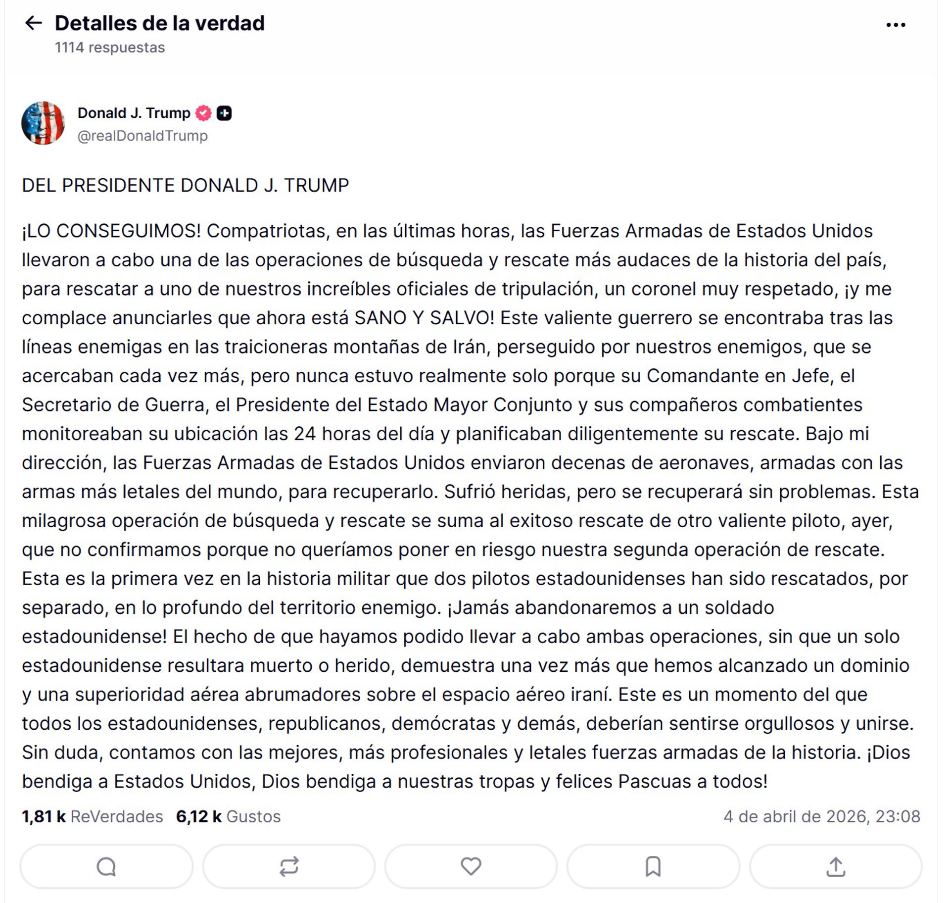 «¡LO LOGRAMOS! Compatriotas, en las últimas horas, las Fuerzas Armadas de Estados Unidos llevaron a cabo una de las operaciones de búsqueda y rescate más audaces de la historia del país, para rescatar a uno de nuestros increíbles oficiales de tripulación», indicó Trump en su publicación.