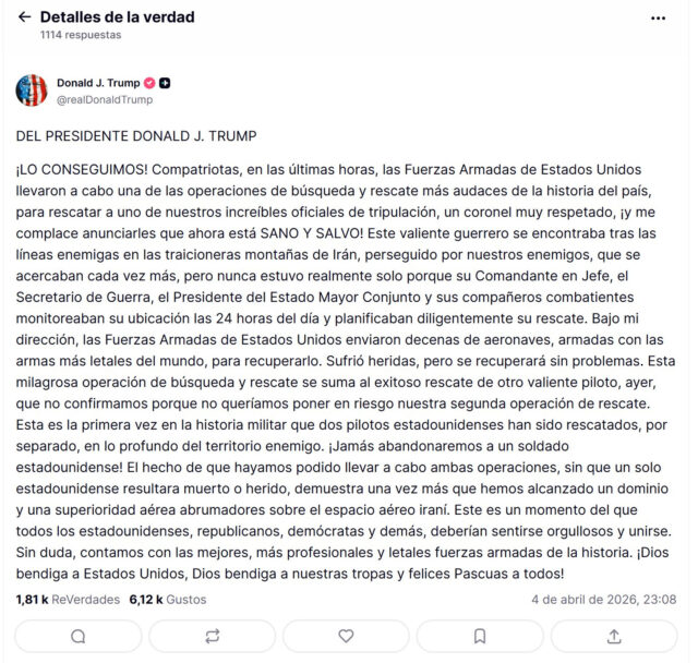 «¡LO LOGRAMOS! Compatriotas, en las últimas horas, las Fuerzas Armadas de Estados Unidos llevaron a cabo una de las operaciones de búsqueda y rescate más audaces de la historia del país, para rescatar a uno de nuestros increíbles oficiales de tripulación», indicó Trump en su publicación.