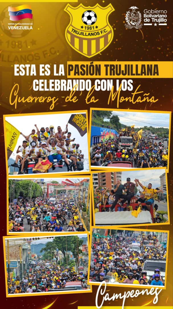 Con presencia masiva de aficionados, integrantes de las barras «Brava», » Viajera», » Curva del Indio», clubes de hinchas, «motorizados con los guerreros», empleados públicos y privados, mototaxistas de varios municipios, estudiantes universitarios, liceístas, comunicadores sociales, gente de radio comunitaria y privada e integrantes de varios organismos oficiales, se realizó este martes 18 de noviembre la denominada » Gran caravana del triunfo» o «Caravana de la victoria»,, la cual demostró en tremendo arraigo pueblerino del «equipo del alma», el Trujillanos Futbol Club.