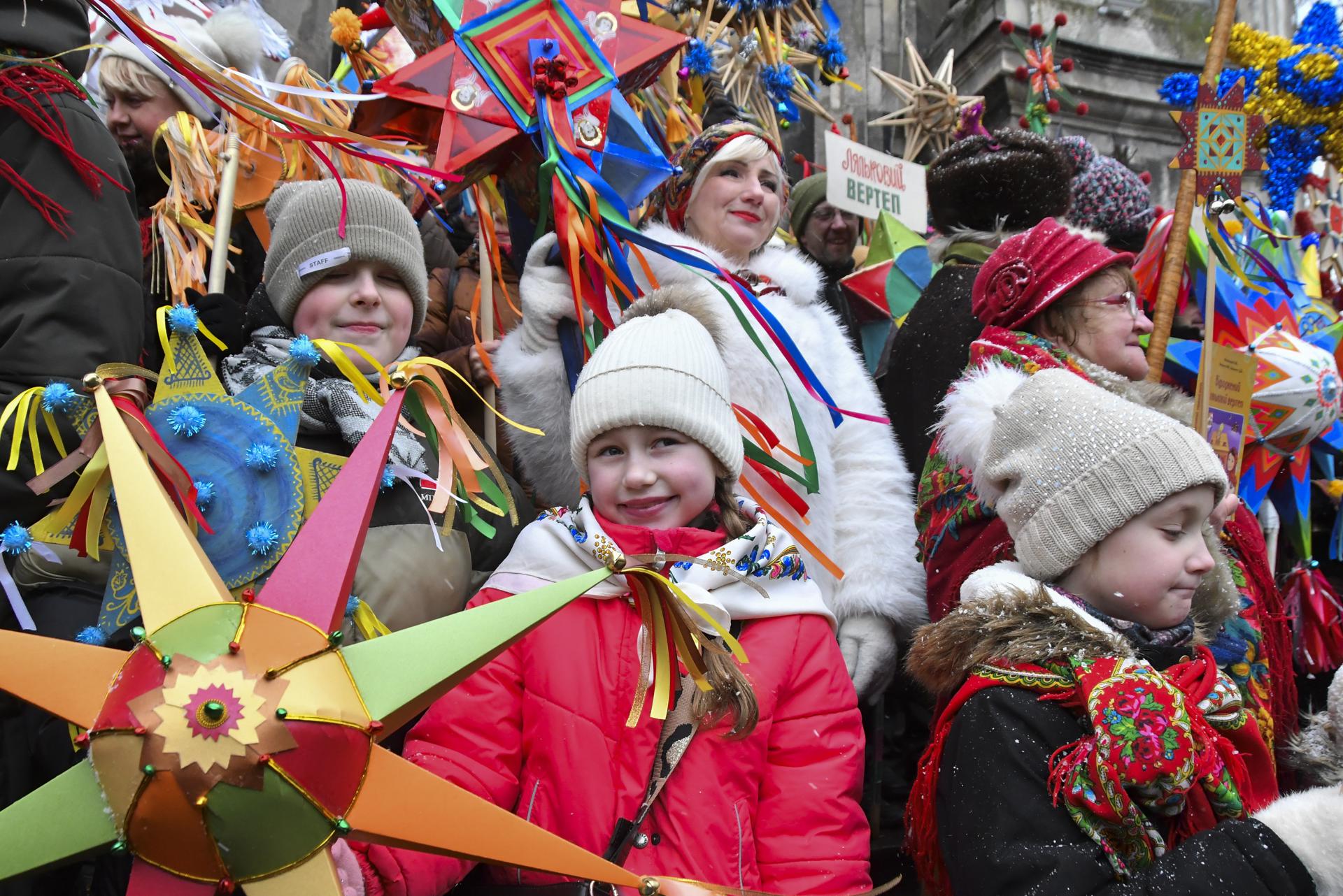 A pesar del fuerte viento y la nieve, una multitud vestida de fiesta llenó el domingo el centro de Leópolis, en el oeste de Ucrania, para participar en el desfile anual de portadores de estrellas.